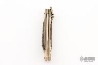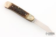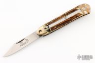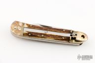 This Lever Lock Automatic by Hubertus Knives features a polished drop point blade. The handle is comprised of nickel silver double bolster and lever with stag scales over brass liners and steel backspacer. Has some light scratches, otherwise excellent condition.