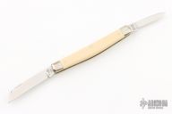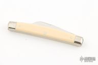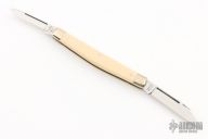 This two blade slipjoint by Bertram features tumbled and polished blades with nail nicks. The handle has nickel silver bolsters, white paper micarta covers, nickel silver liners and stainless steel springs. Includes the original box.  Excellent condition.