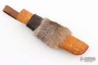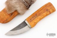 This fixed blade from H. Roselli features an upswept blade with forge finish flats and satin scandi grind,.144" blade stock and 1.304" blade depth, hidden tang construction. Has a wood grip. Includes a wooden sheath with leather collar and reindeer fur overlay. Has some minor patina, otherwise excellent condition. Comes with original box and papers.