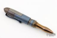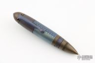 This Zeppelin Pen from Dmitry Streltsov features an anodized "Bomber Theme" titanium body and pocket clip. Tip unscrews and turns around to screw in and reveal the pen tip. Comes with original box and sheath. Excellent condition.