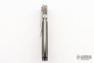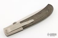 This liner lock folder by John W Smith features a hand rubbed satin finish blade with thumbdisc and notched thumbrest. Bead blasted and dovetailed titanium bolsters and liners, carbon fiber scales, black linen micarta backspace, tip down titanium clip. Strong lock up, nice detent and blade seating. Has a few light scuffs/scratches, otherwise excellent condition.