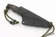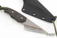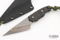 This knife by C&C (please let us know if you know who this is) features a two-tone blade with notched thumbrest, .250" blade stock and 1.111" blade depth, full tang construction. The handle has carbon fiber scales. Comes with a kydex sheath. Has some scratches, otherwise excellent condition.