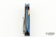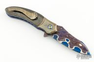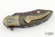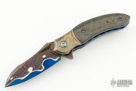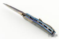 This knife by Peter Martin features a Hot Blued Sole Authorship San Mai Damascus blade with Damascus thumblug and a flipper. The handle has mokume bolsters, carbon fiber scales, anodized/jeweled titanium liners, Damascus backspacer, and a tip up mokume clip with hidden screws, anodized titanium pivot and pivot collars. Martin is signed on the inside of the backspacer.  Nice detent, lockup and blade seating. Excellent Condition.