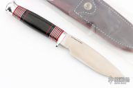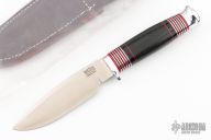 This Michigan Hunter by Bark River features a satin finished blade with false top edge, .156" blade stock and 1.237" blade depth, hidden tang construction. The handle has a polished aluminum guard and butt, black canvas micarta grip with red/aluminum/black/Green Sparkle spacers. Comes with original brown leather sheath and box. New condition.