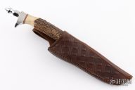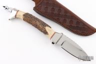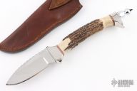This knife by Gary Corum features a mirror finished blade with fileworked spine, .176" blade stock and 1.222" blade depth, hidden tang construction. The handle has a stainless steel guard, stag grip and stainless steel butt, red/white spacers. Comes with a hand tooled brown leather sheath. Has a few light scratches, otherwise excellent condition.