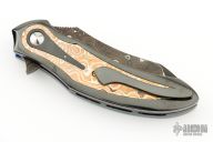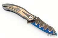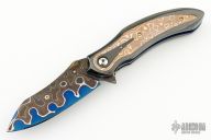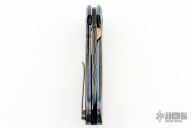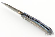 This QSB by Peter Martin features a sole authorship San Mai Damascus blades with a single mokume thumbstud and a notched thumbrest.  The handle has zirconium scales with mokume inlays, zirconium pivot collars, San Mai Damascus backspacer and tip up zirconium pocket clip with hidden screws.  Nice Detent, lockup and blade seating.  Excellent Condition.