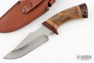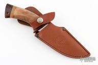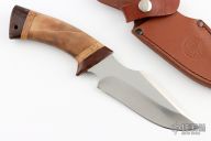 This knife by ROSarms features a satin finished blade with false top edge and mirror polished flats, .189" blade stock, 1.803" blade depth, hidden tang construction. The handle has a canvas micarta guard and butt, wood grip. Comes with a brown leather sheath. Excellent condition.