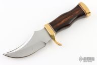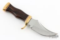 This Skinner by R.W. Wilson features a mirror polished blade with false top edge, .247" blade stock and 1.616" blade depth, hidden tang construction. The handle has a brass guard and butt, wood grip with white/grey/red spacers. Has some light patina, otherwise excellent condition.