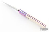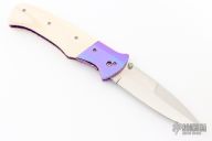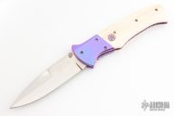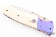 This knife by Butch Vallotton features a mirror polished spear point blade with dual thumbstuds and a fileworked blade spine.  The handle has anodized titanium liners, fossil walrus sclaes over anodized and fileworked titanium liners.  Excellent Condition.