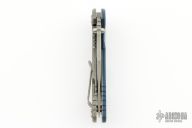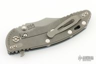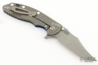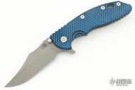 This XM-18 Flipper by Rick Hinderer Knives features a 3.5" working finish blade, notched thumbrest and flipper, dual thumbstuds. The handle has a black/blue G-10 scale, and working finished titanium handle and satin finished hardware, filler tab, and titanium clip. Clip can be mounted for tip up or down carry. Nice lockup, seating, and detent. Comes with original box and extra hardware. Excellent Condition.
