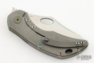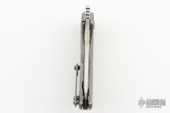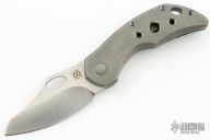 This Busker Semper (B410-S) by Olamic Cutlery, features a satin finished clip point blade with a swedge thumb hole and notched front flipper. The handle a Kinetic Mist finished titanium frame over an anodized floating titanium backspacer. Pocket clip is positioned for right hand, tip up carry. Includes original padded case and makers card dated 9/10/19. Excellent condition.