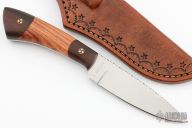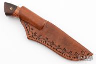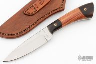 This hunter by Tom McLuin features a hand rub satin finished blade that has filework on spine and tang, .131" blade stock and 1.010" blade depth, full tang construction. The handle has ebony dovetailed bolsters, olive wood scales with mosaic pins. Comes with a hand tooled brown leather sheath. "97 ATS" on ricasso. Excellent condition.