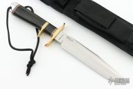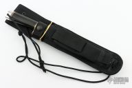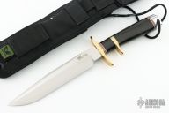 This Model 1-7 Subhilt from Blackjack Knives features a satin finished blade with swedge. The handle is comprised of a brass guard and sub-hilt with red, white and blue spacers, black linen micarta handle and aluminum pommel over hidden tang construction. Includes nylon sheath with belt loop and original box. Excellent condition.