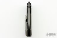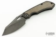 This Evolution 3.0 by Custom Knife Factory features a dark stonewash finished blade with notched thumbrest and thumbhole. The handle has a dark stonewashed bark finished titanium frame with a backspacer. Micarta inlays, and ZrTi tip-up clip. Comes with velcro case, additional clip, and COA. Nice detent, lockup and blade seating. Excellent condition. #247 and dated 8-22.