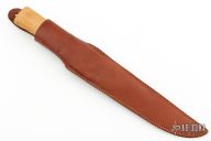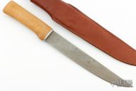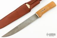 This Fillet knife by H. Roselli features a satin finished blade with a hidden tang construction. .052" Blade Stock. 1.237" Blade Depth. The handle features a wood grip. Includes a brown leather sheath. Excellent Condition. Steel: UHC Steel.