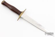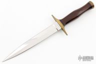 This Dagger by Martin Pullen features a mirror finished blade with .160" blade stock and .864" blade depth, hidden tang construction. The handle has a brass guard and butt, cocobolo grip with red/black spacers. Excellent condition.