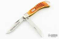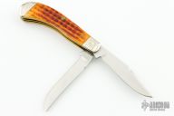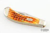 This slipjoint by Case features 2 mirror polished blades with nail nicks. The handle has engraved nickel silver bolsters, jigged bone covers, brass liners and stainless springs. Comes with original box and papers. Excellent condition.