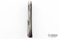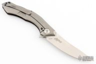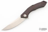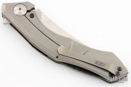 This 0462 Sinkevich Design flipper by Zero Tolerance features a satin finished upswept blade with flipper and swedge. The handle has a red/black carbon fiber and tumbled titanium frame, black aluminum backspacer and a tip up reversible titanium clip. Nice detent, lockup and blade seating, rides on bearings. Has stainless steel lockface insert and overtravel stop, ceramic detent ball. S/N 8100. Comes with original box and papers. Has a couple light scuffs, excellent condition otherwise.