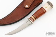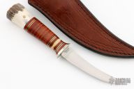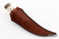 This Scagel Style Hunter features a satin finished blade with .093" blade stock, .645" blade depth, hidden tang construction. The handle has a sterling silver guard, stacked leather grip and a stag pommel. Includes a brown leather sheath. Has some light scuffs and scratches, good condition otherwise.