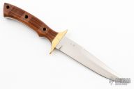 This Alley Kitten by Peter Bauchop features a satin finished blade with sharpened top edge. .183" blade stock and 1.056" blade stock, full tang construction. The handle is comprised of a brass guard with white fiber spacers and grooved wood scales with hollow pins. Includes a leather zippered case. Numbered 12 on ricasso. Some patina on guard but overall excellent condition.