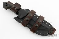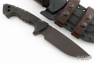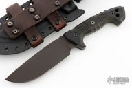 This M-33 by Miller Bros Blades features a black drop point blade with notched thumbrest made from Z-Wear PM steel, .299" blade stock 1.755" blade depth, full tang construction. The handle has textured black G-10 scales with brown G-10 liners, notched tang, lanyard holes in extended tang. Comes with a kydex/leather sheath. Has a couple light scuffs, otherwise excellent condition.