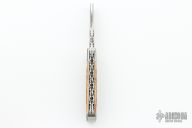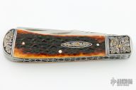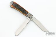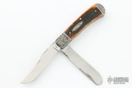 This Two-Blade Trapper by Bill Ruple features hand rub satin finished blades with nail nicks and fileworked spines. The handle has engraved stainless steel bolsters with 24k gold inlays, jigged bone covers with engraved stainless steel escutcheon, fileworked stainless steel liners and stainless steel springs. Half stop blade positioning on both blades, flush in all positions. Comes with a zippered case. Excellent Condition.