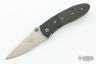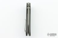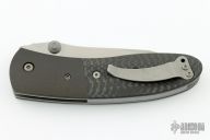 This Lightfoot LCC D/A side opener by Microtech has a stonewashed blade, black aluminum bolsters, and carbon fiber scales. Stainless steel clip and liners. Dated 03/2001 and #4722. Excellent condition. Includes a nylon sheath.