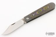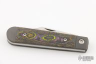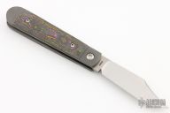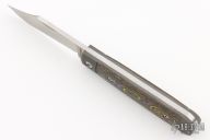 This Little Bro Jack slipjoint model by Jack Wolf Knives features a satin finished clip point blade with nailnick. The handle has integral bead blast finish pinched and fluted titanium bolsters and liners, carbon fiber scales with a stainless spring. Comes with box, metallic tube with Sean Tiffany artwork, leather slip, sticker and microfiber cleaning cloth. New from Maker!