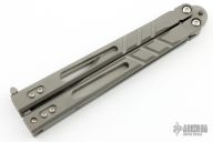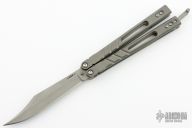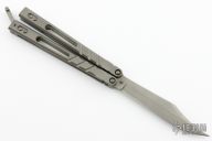 This Alpha Beast Balisong 3.0 from Blade Runner Systems (BRS) features a tumble finished clip point blade. The handle has a milled and tumbled titanium with T latch on pommel. Comes with original box and papers. Excellent condition.