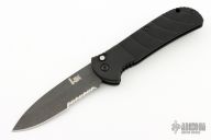 This auto by Heckler and Koch features a black drop point blade with partial serrations. The handle has a black aluminum frame with tip up black stainless steel clip. Has safety. Comes with the original box and papers. Excellent Condition.