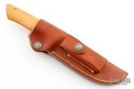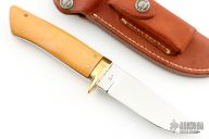 This hunter by TJ Yancey features a mirror finished blade with .193" blade stock and 1.079" blade depth, full tapered tang construction. The handle has a brass guard, yellow paper micarta scales with maroon liners, brass pins and scrimshaw on the handle, signed A. Yancey. Comes with a Randall brown leather sheath. Excellent condition. "D 51" on the blade.