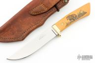 This hunter by TJ Yancey features a mirror finished blade with .197" blade stock and 1.056" blade depth, full tapered tang construction. The handle has a brass guard, yellow paper micarta scales with black liners, brass pins and scrimshaw on the handle, signed A. Yancey. Comes with a brown leather sheath. Has a couple light scratches, otherwise excellent condition. "Stanley Kwasnicki" on the blade.