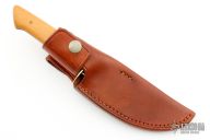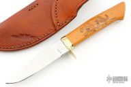 This hunter by TJ Yancey features a mirror finished blade with .154" blade stock and .892" blade depth, full tapered tang construction. The handle has a brass guard, yellow paper micarta scales with maroon liners, brass pins and scrimshaw on the handle, signed A. Yancey. Comes with a brown leather sheath. Excellent condition. "2" on the blade.