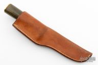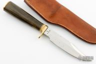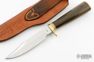 This Model L by Ralph Bone features a satin finished blade with a sharpened top edge, .188" blade stock and .989" blade depth, hidden tang construction. The handle is comprised of brass guard and butt, bone and brass spacer, buffalo horn grip. #130 on the blade. Comes with a brown leather sheath. Has scratches and patina on the blade, otherwise good condition.