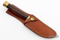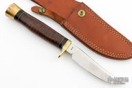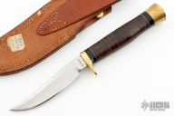 This Model G by Ralph Bone features a satin finished blade with swedge, .186" blade stock and .827" blade depth, hidden tang construction. The handle is comprised of brass guard and butt, black and brass spacers, stacked leather grip. #722 on the blade. Comes with brown leather sheath. Has some patina, otherwise excellent condition.