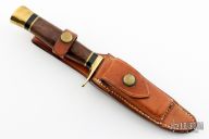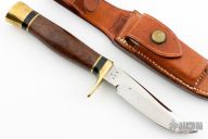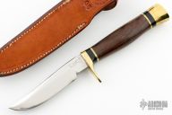 This Model G by Ralph Bone features a satin finished blade with swedge, .180" blade stock and .878" blade depth, hidden tang construction. The handle is comprised of brass guard and butt, black and brass spacers, rosewood grip. #425 on the blade. Comes with brown leather sheath. Has some oxidation spots, otherwise good condition.