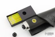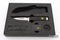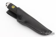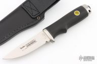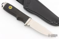 This knife has a satin finished drop point blade with notched thumb-rest. 1/8" blade stock and 1" blade depth, hidden tang construction. The handle has stainless steel guard and pommel, and ebony handle with acryl glass cones framed by precise aluminum rings. Inside the handle is a space for a small glow stick to illuminate the handle. Comes with black leather sheath, a box of small glow sticks for the handle, and original box and papers. Excellent condition.