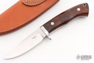 Wayne sold his first knife in 1985. "I am a one-man shop and make a limited number of knives per year. I use ATS 34 (154 cm) which is professionally heat treated to a Rockwell C Hardness of 58-60. Handle materials, such as stag, desert iron wood, African blackwood and curly/birdseye maple, when stained with chromic acid, are some of the better natural handle materials. All knives come with sheaths made from 9-10 oz. vegetable tanned leather. I make all sheaths and then wet form them to each knife. After the sheath is dry, it is dipped in oil and harness dressing to protect it from moisture and to help maintain its fit to the knife."