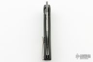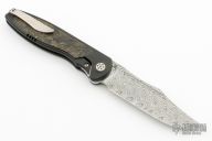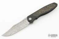 This Mini Tempest from Brian Nadeau features a Damasteel bowie blade with a fuller and notched thumbrest/front flipper. The handle has a black PVD titanium frame with Gold Dark Matter FatCarbon inlays, satin titanium tip up clip. Nice detent, lockup and blade seating, stainless lockface insert. Has a couple light scratches, otherwise excellent Condition.