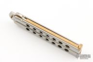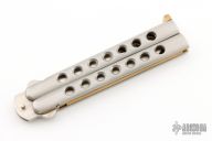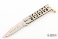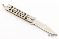 This Butterfly Knife by C Jul Herbertz features a satin finished clip point blade. The handles are stainless steel with brass liners and latch. Tight latch. Has a couple light scratches, otherwise excellent condition.