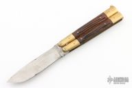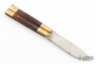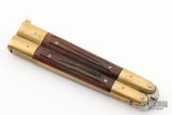 This balisong from the Philippines features a drop point blade with a satin finished blade. The handle has brass bolsters, brass channel construction, jigged wood scales, brass T-latch. Has scratches and patina, otherwise good condition.