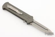 This Strelka OTF Auto by No Limit Knives features a bead blast finished blade. The handle has a grey aluminum frame with a tip down stainless steel clip. Comes with a zippered case. Excellent condition. Has some rattle in the open position.