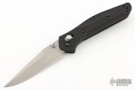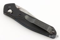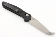 This Osborne designed Benchmade features a stonewashed plain edge blade, black aluminum handle, tip up reversible stainless steel clip. Axis lock mechanism. Comes with original box, papers and drawstring pouch. Excellent condition.