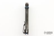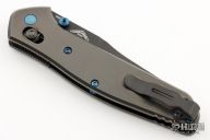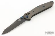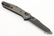 This 940BK Osborne Axis Lock Folder from Benchmade has a black coated clip point blade with false top edge and dual thumbstuds. Handle is Titanium with a black finished stainless steel tip up clip (RH/LH Reversible), and anodized hardware. Nice blade seating and lockup. Comes with original box, papers and drawstring pouch. Excellent condition. #115