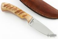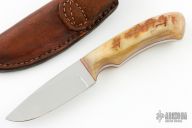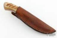 This knife by Aric Fontaine features a mirror polished blade with .155" blade stock and 1.083" blade depth, full tang construction. The handle has sheep horn scales with red liners. Comes with a brown leather sheath. One of the scales is starting to separate from the tang, otherwise good condition.