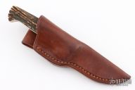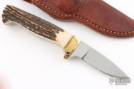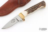 This knife by Pat Mitchell features a mirror polished blade with .179" blade stock and .863" blade depth, full tang construction. The handle has brass bolsters and stag scales. Comes with a brown leather sheath. Has a few light scratches, otherwise excellent condition.