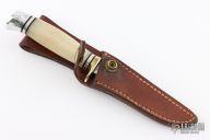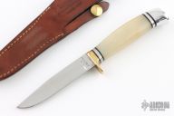 This knife by Lew Booth features a satin finished blade with .112" blade stock and .750" blade depth, hidden tang construction. The handle has a brass guard and aluminum butt, composite grip with black/aluminum spacers. Comes with a brown leather sheath. Has some light spotting on the blade, otherwise good condition. #43