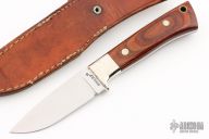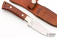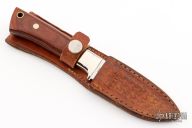 This knife by Sharp features a satin finished blade with .142" blade stock and 1.041" blade depth, full tang construction. The handle has nickel silver bolsters, laminated wood scales , lanyard hole. Comes with a brown leather sheath. Has some light scratches, otherwise good condition.