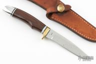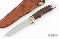 Lew Booth was a knife maker from Boonton, New Jersey. His knives, made in the mid-1960s, were of top quality. He made sheath knives that were beautifully handled with nickel silver pins and hardwood scales. These knives also came with a sport and camping sheath that had a built-in sharpening stone. His work is still appreciated and collected today