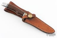 This knife by Lew Booth features a satin finished blade with .120" blade stock and .750" blade depth, hidden tang construction. The handle has a brass guard and aluminum butt, black/brown canvas micarta grip with black/aluminum spacers. Comes with a brown leather sheath. Has some spotting on the blade, otherwise good condition. #42